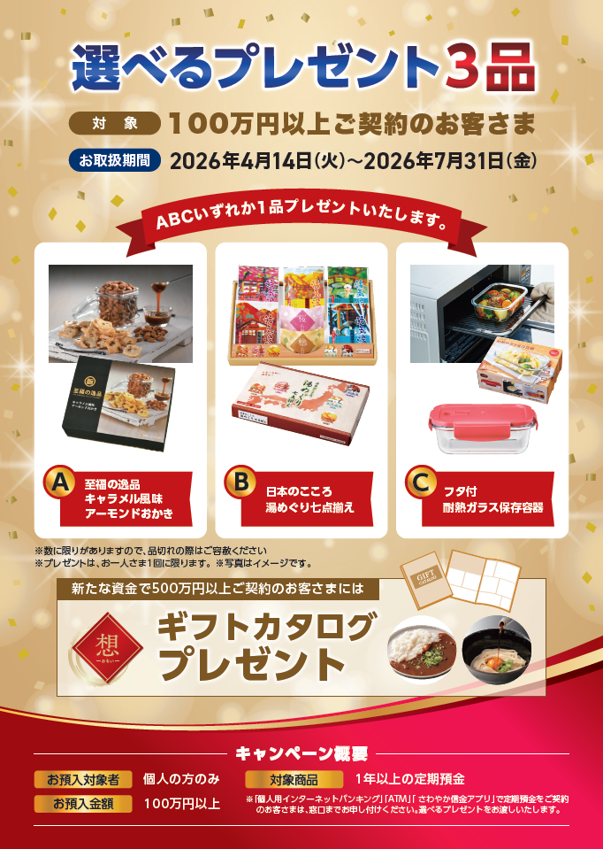 A. 至福の逸品 キャラメル風味アーモンドおかき B. 日本のこころ 湯めぐり七点揃え C. フタ付耐熱ガラス保存容器 D. 新たな資金で500万円以上ご契約の方にギフトカタログ ※プレゼントはA・B・Cのいずれかひとつ、おひとりさま1回限りとさせて頂きます。 ※数に限りがありますので、品切れの際にはご容赦ください。 |