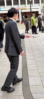 毎年恒例となっている、駅前での「確定申告推進ビラ配り」を税務署の方々と行いました。