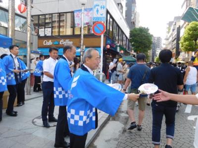 今年は例年にも増して厳しい暑さの中、少しでも“涼”を取っていただこうと、麻布十番まつりのイラストとさわやか信用金庫名を印刷した団扇を1,000枚作成し、篠理事長を始め、港区内店舗の役職員とともに配布しました。